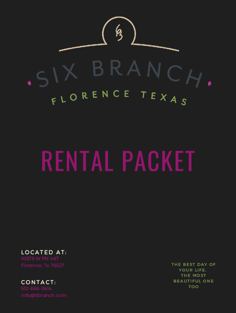 RENTAL PACKETLOCATED AT: 10575 W FM 487 Florence, TX 76527CONTACT: 5126880414 info@6branch.comTHE the BEST DAY OF YOUR LIFE, THE MOST BEAUTIFUL ONE WELCOME TO 6BRANCH VENUE 6Branch is located on 260