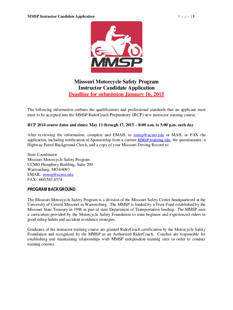 MMP Instructor Candidate Application Page |1Missouri Motorcycle Safety Program Instructor Candidate Application Deadline for submission January 16, 2015, The following information outlines the qualifications