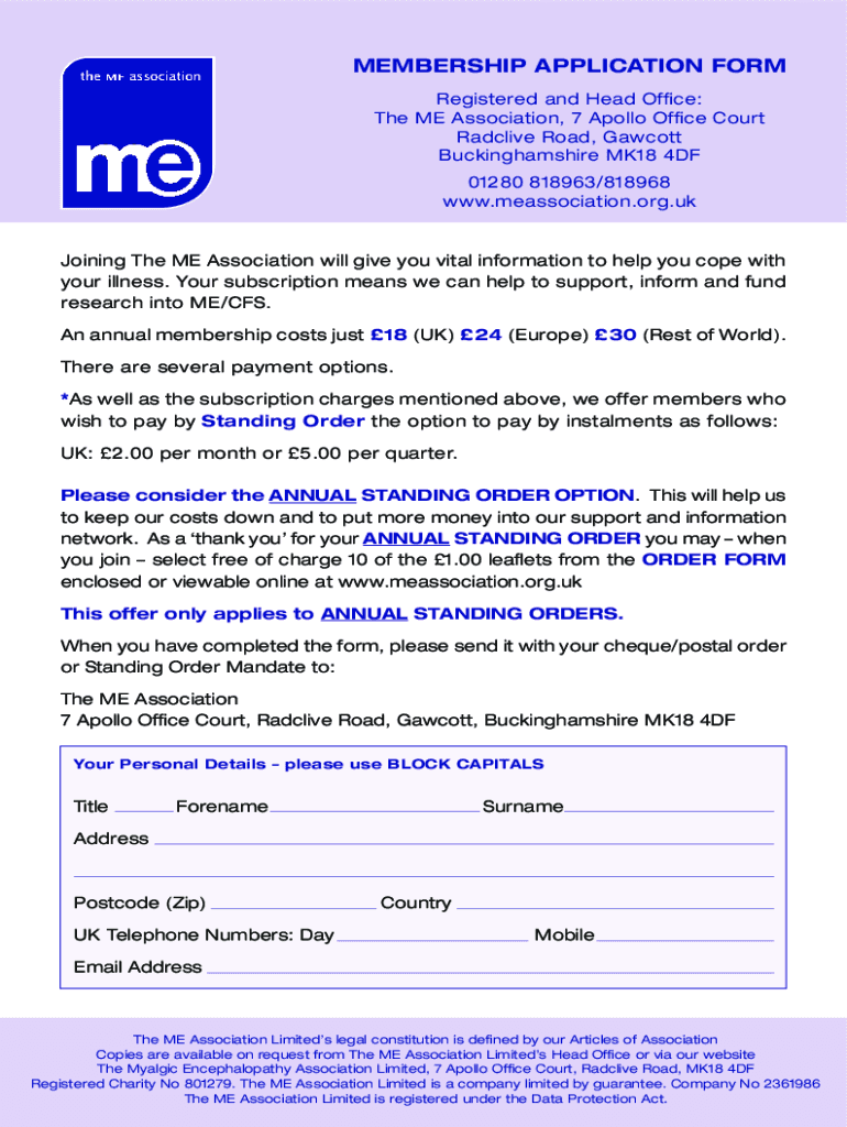 MEMBERSHIP APPLICATION FORM Registered and Head Office: The ME Association, 7 Apollo Office Court Radcliffe Road, Alcott Buckingham shire MK18 4DF 01280 818963/818968 www.meassociation.org.ukJoining