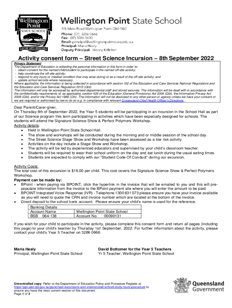 Activity consent form Street Science Incursion 8th September 2022 Privacy Statement The Department of Education is collecting the personal information in this form in order to: obtain consent for