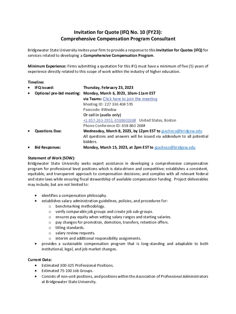 Invitation for Quote (IF No. 10 (FY23): Comprehensive Compensation Program Consultant Bridgewater State University invites your firm to provide a response to this Invitation for Quotes (IF) for services