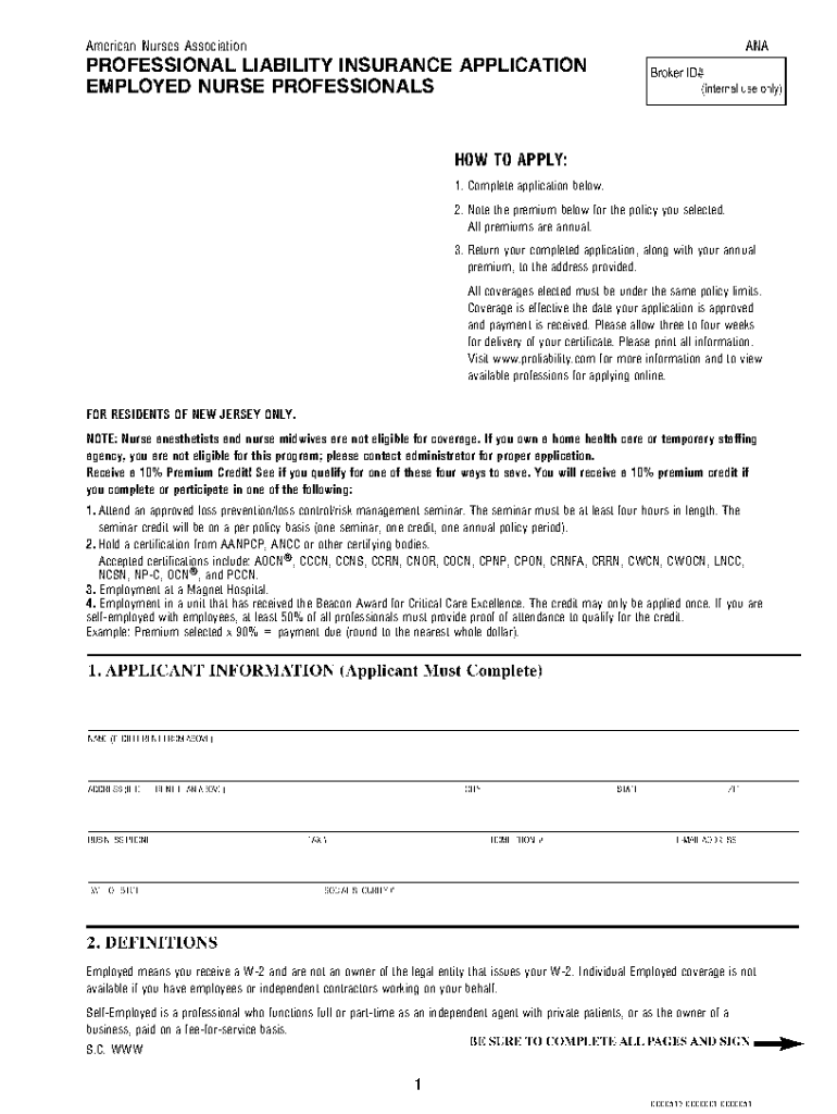 Marmoore_pleenjamnanmAmerican Nurses AssociationANAPROFESSIONAL LIABILITY INSURANCE APPLICATION EMPLOYED NURSE PROFESSIONALS HOW TO APPLY: 1. Complete application below. 2. Note the premium below