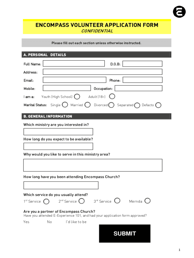 ENCOMPASS VOLUNTEER APPLICATION FORM CONFIDENTIAL Please fill out each section unless otherwise instructed. A. PERSONAL DETAILS Full Name:D.O.B:Address: Email:Phone:Mobile: I am a:Occupation: Youth