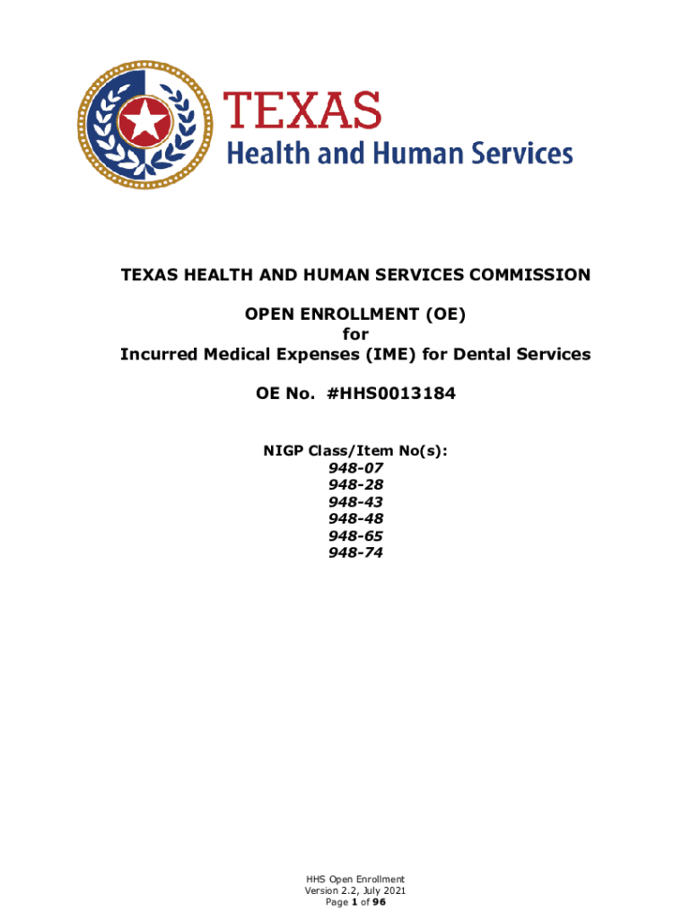 TEXAS HEALTH AND HUMAN SERVICES COMMISSION OPEN ENROLLMENT (OE) for Incurred Medical Expenses (IME) for Dental Services OE No. #HHS0013184 NIGH Class/Item No(s): 94807 94828 94843 94848 94865 94874HHS