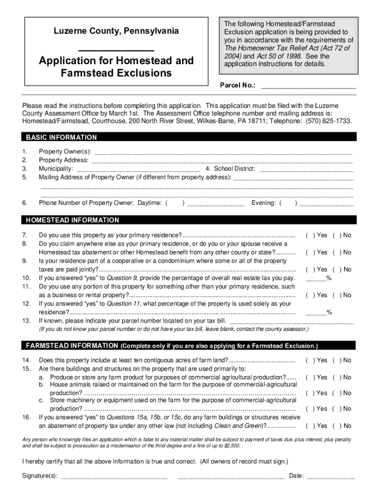 Luzerne County, Pennsylvania Application for Homestead and Farmstead Exclusions following Homestead/Farmstead Exclusion application is being provided to you in accordance with the requirements of