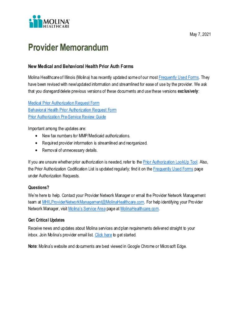 May 7, 2021Provider Memorandum New Medical and Behavioral Health Prior Auth Forms Molina Healthcare of Illinois (Molina) has recently updated some of our most Frequently Used Forms. They have been