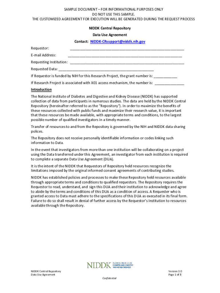 SAMPLE DOCUMENT FOR INFORMATIONAL PURPOSES ONLY DO NOT USE THIS SAMPLE. THE CUSTOMIZED AGREEMENT FOR EXECUTION WILL BE GENERATED DURING THE REQUEST PROCESS NID DK Central Repository Data Use Agreement