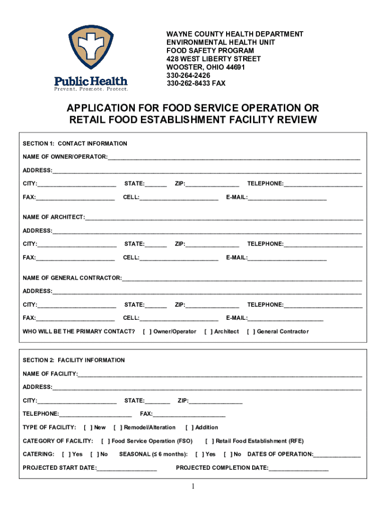 WAYNE COUNTY HEALTH DEPARTMENT ENVIRONMENTAL HEALTH UNIT FOOD SAFETY PROGRAM 428 WEST LIBERTY STREET WOOSTER, OHIO 44691 3302642426 3302628433 APPLICATION FOR FOOD SERVICE OPERATION OR RETAIL FOOD