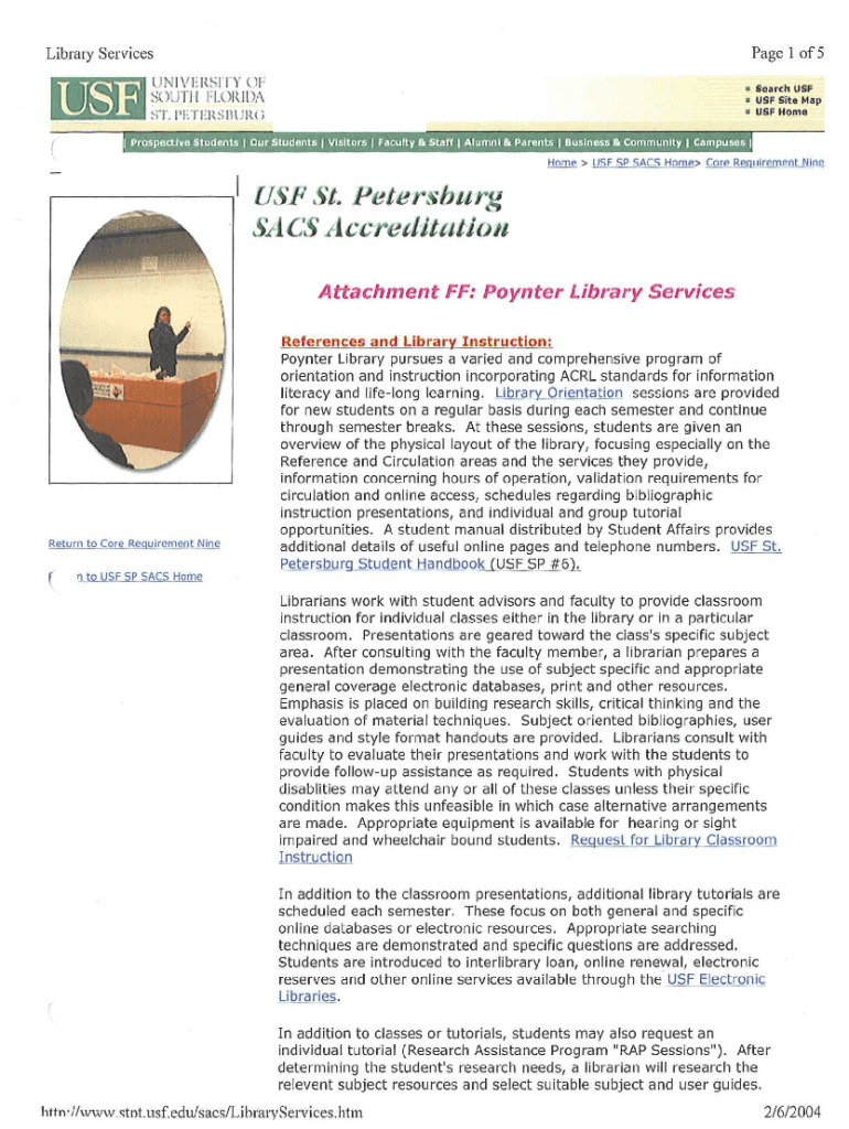 Page 1 of5Libraty Services UN IV DENSITY OF SOUTH I FLORIDA Search USF Site Map USF Homes. PETERS t ; R((Home USF SP SACS Home Core Requirement Nine.1 USF St. P Petersburg AG Accretittttil)TL Attachment
