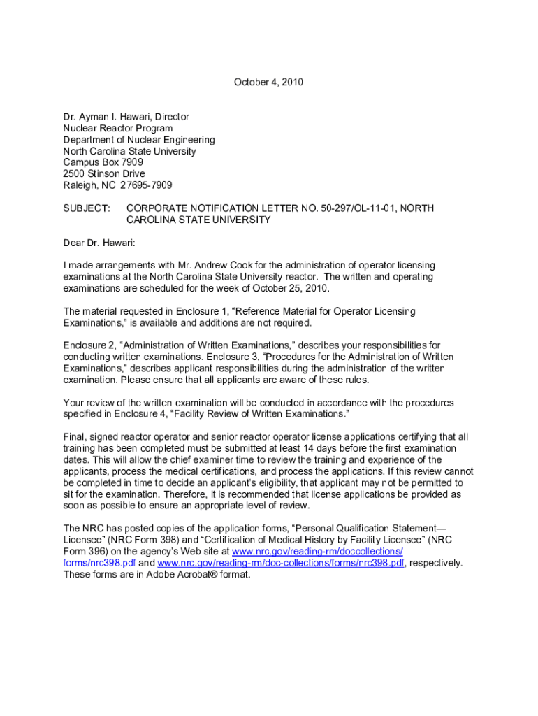 October 4, 2010, Dr. Amman I. Hawaii, Director Nuclear Reactor Program Department of Nuclear Engineering North Carolina State University Campus Box 7909 2500 Stinson Drive Raleigh, NC 276957909 SUBJECT:CORPORATE