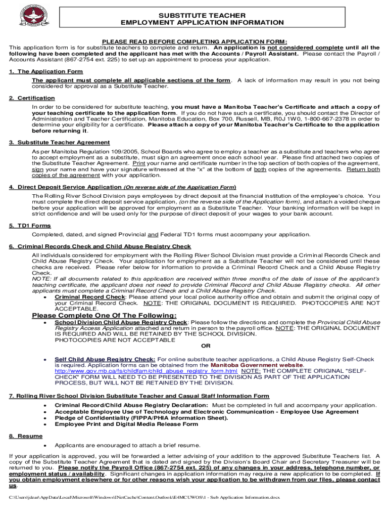 SUBSTITUTE TEACHER EMPLOYMENT APPLICATION INFORMATION PLEASE READ BEFORE COMPLETING APPLICATION FORM: This application form is for substitute teachers to complete and return. An application is not