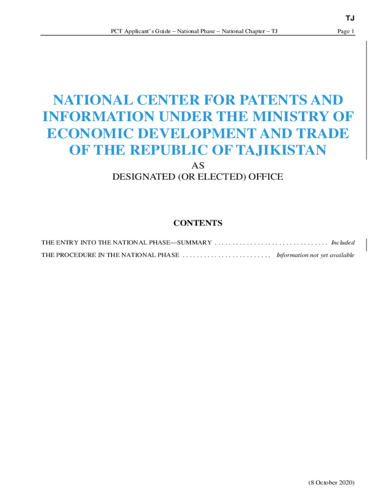 TJ PCT Applicants Guide National Phase National Chapter TJ Page 1NATIONAL CENTER FOR PATENTS AND INFORMATION UNDER THE MINISTRY OF ECONOMIC DEVELOPMENT AND TRADE OF THE REPUBLIC OF TAJIKISTAN AS DESIGNATED