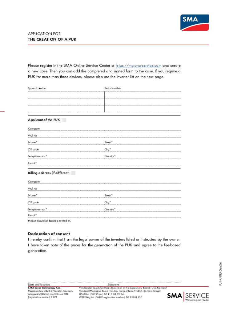 APPLICATION FOR THE CREATION OF A UK Only valid for Additional information concerning this application The safety of your PV system is important for us. In order to protect you from unauthorized access,
