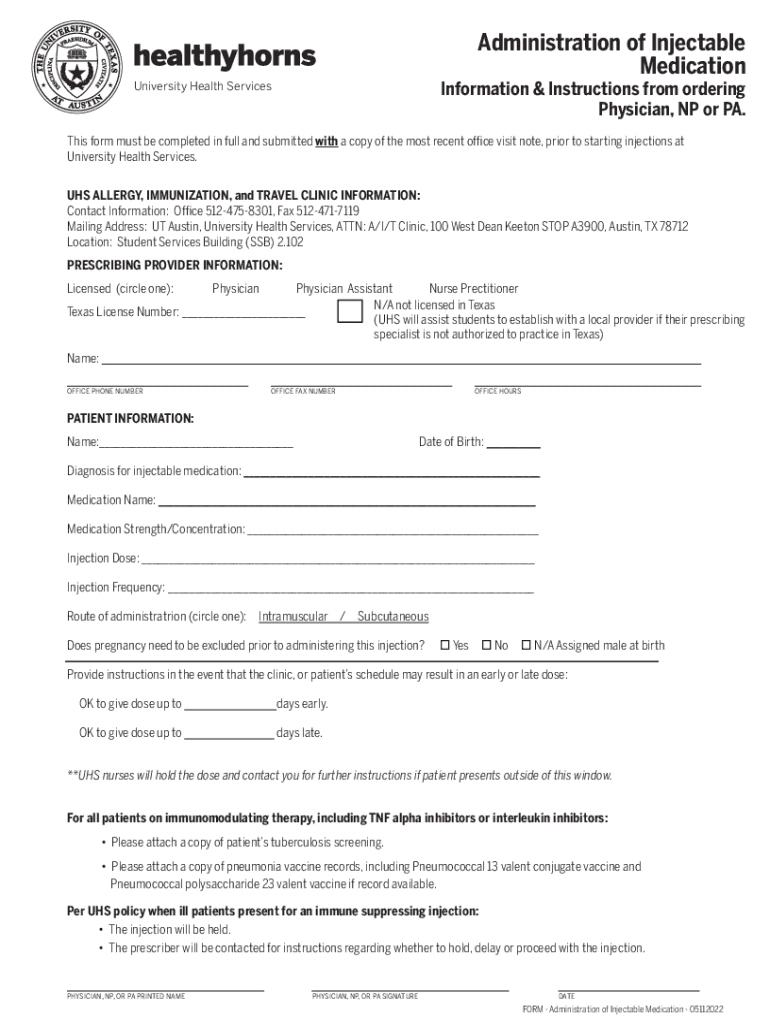 Administration of Injectable MedicationInformation & Instructions from ordering Physician, NP or PA. University Health ServicesThis form must be completed in full and submitted with a copy of the