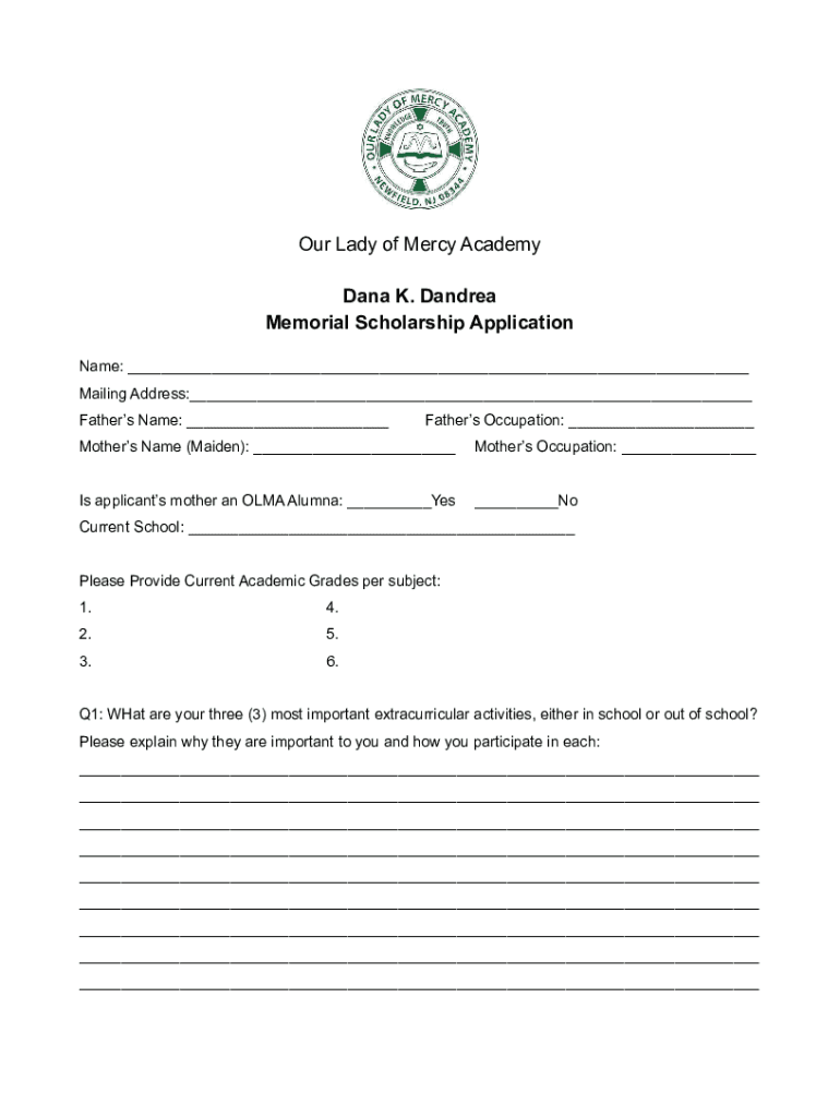 Our Lady of Mercy Academy Dana K. Andrea Memorial Scholarship Application Name: ___ Mailing Address:___ Fathers Name: ___Fathers Occupation: ___Mothers Name (Maiden): ___Mothers Occupation: ___Is