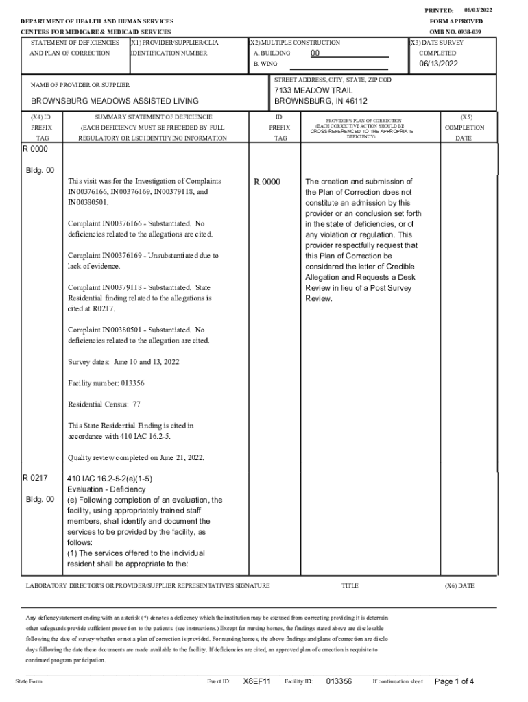 08/03/2022PRINTED: DEPARTMENT OF HEALTH AND HUMAN SERVICESFORM APPROVEDCENTERS FOR MEDICARE & MEDICAID SERVICES STATEMENT OF DEFICIENCIES(X1) PROVIDER/SUPPLIER/LIGAND PLAN OF CORRECTIONIDENTIFICATION