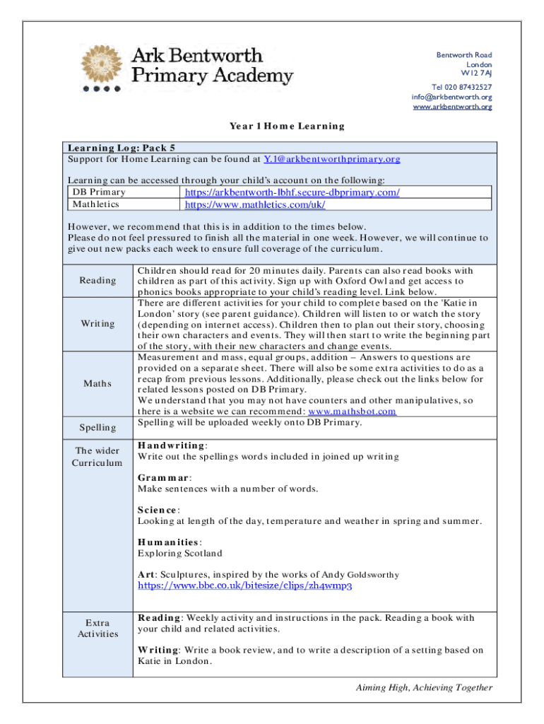 Bent worth Road London W12 7AJ Tel 020 87432527 info@arkbentworth.org www.arkbentworth.orgYear 1 Home Learning Log: Pack 5 Support for Home Learning can be found at Y.1@arkbentworthprimary.org Learning
