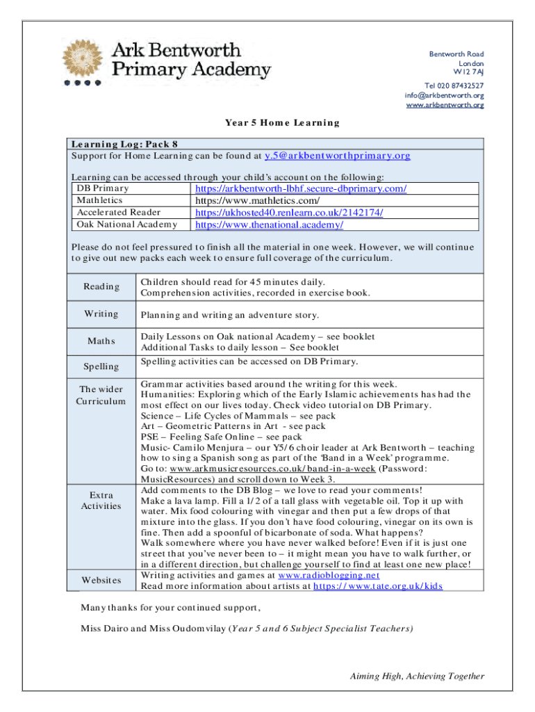 Bent worth Road London W12 7AJ Tel 020 87432527 info@arkbentworth.org www.arkbentworth.orgYear 5 Home Learning Log: Pack 8 Support for Home Learning can be found at y.5@arkbentworthprimary.org Learning