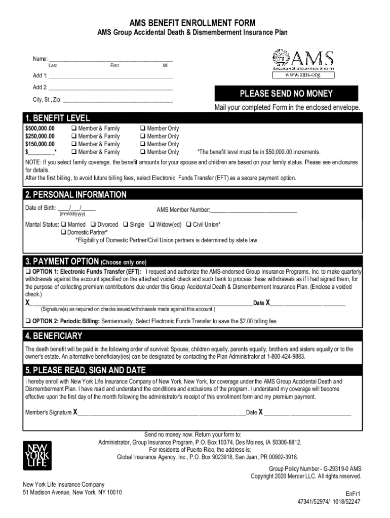 TEAMS BENEFIT ENROLLMENT FORMATS Group Accidental Death & Dismemberment Insurance Plan Name: ___ LastFirstMIAdd 1: ___ Add 2: ___ City, St., Zip: ___PLEASE SEND NO MONEY Mail your completed Form in