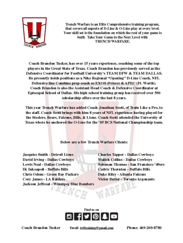 Trench Warfare is an Elite Comprehensive training program, that covers all aspects of Line & Line play at every level. Your skill set is the foundation on which the rest of your game is built. Take
