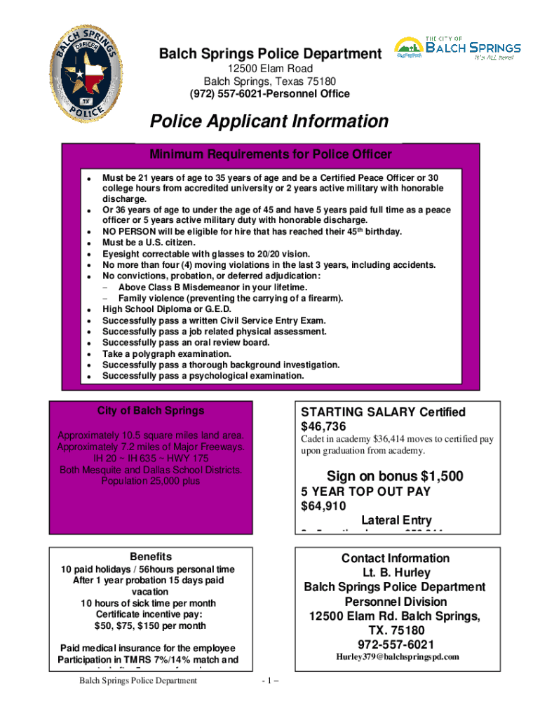 Batch Springs Police Department 12500 Elam Road Batch Springs, Texas 75180 (972) 5576021Personnel OfficePolice Applicant Information Minimum Requirements for Police Officer Must be 21 years of age