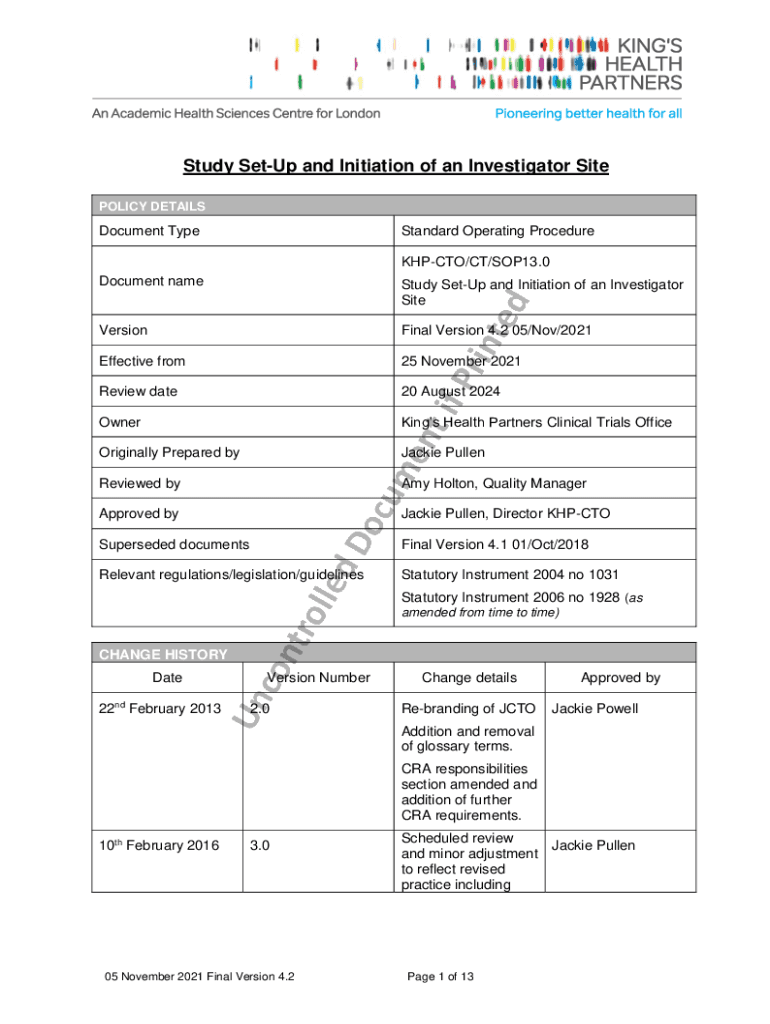 PHOTO/CT/SOP13.0Document restudy SetUp and Initiation of an Investigator