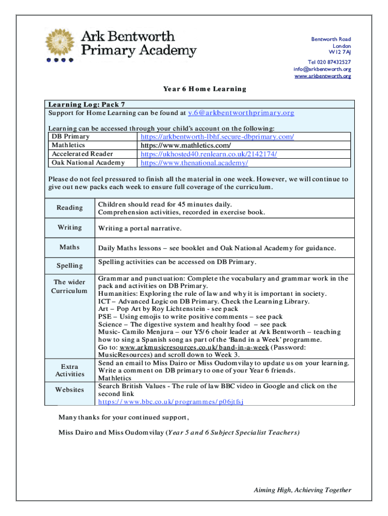 Bent worth Road London W12 7AJ Tel 020 87432527 info@arkbentworth.org www.arkbentworth.orgYear 6 Home Learning Log: Pack 7 Support for Home Learning can be found at y.6@arkbentworthprimary.org Learning