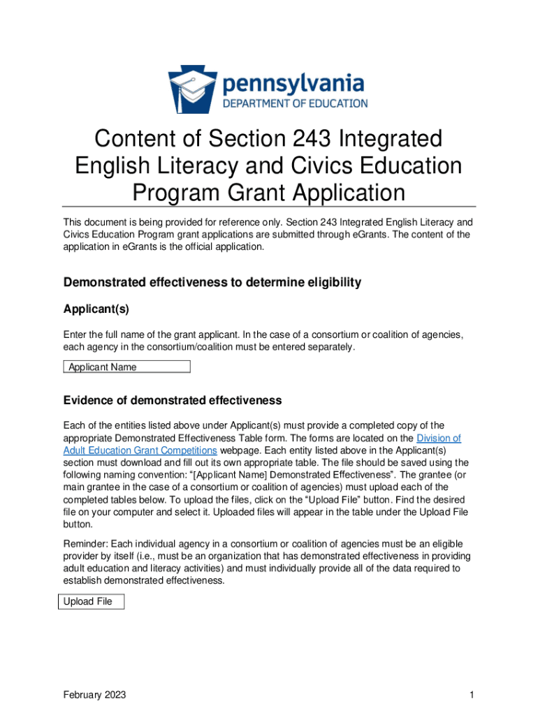 Content of Section 243 Integrated English Literacy and Civics Education Program Grant Application This document is being provided for reference only. Section 243 Integrated English Literacy and Civics