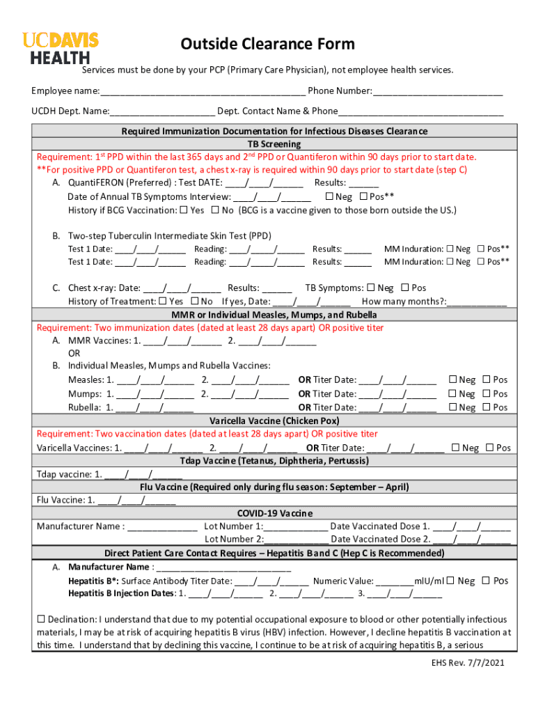 Outside Clearance Form Services must be done by your PCP (Primary Care Physician), not employee health services. Employee name:___ Phone Number:___ CDH Dept. Name:___ Dept. Contact Name & Phone___