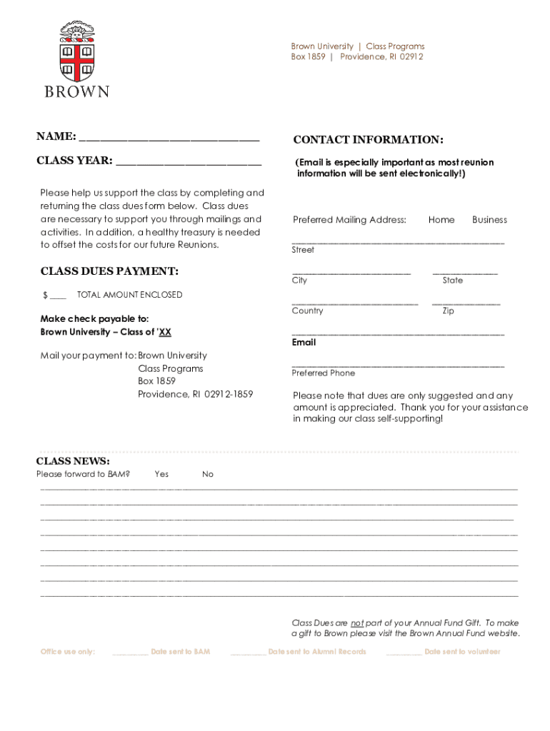 Brown University Class Programs Box 1859 Providence, RI 02912NAME: ___CONTACT INFORMATION:CLASS YEAR: ___(Email is especially important as most reunion information will be sent electronically!) Please