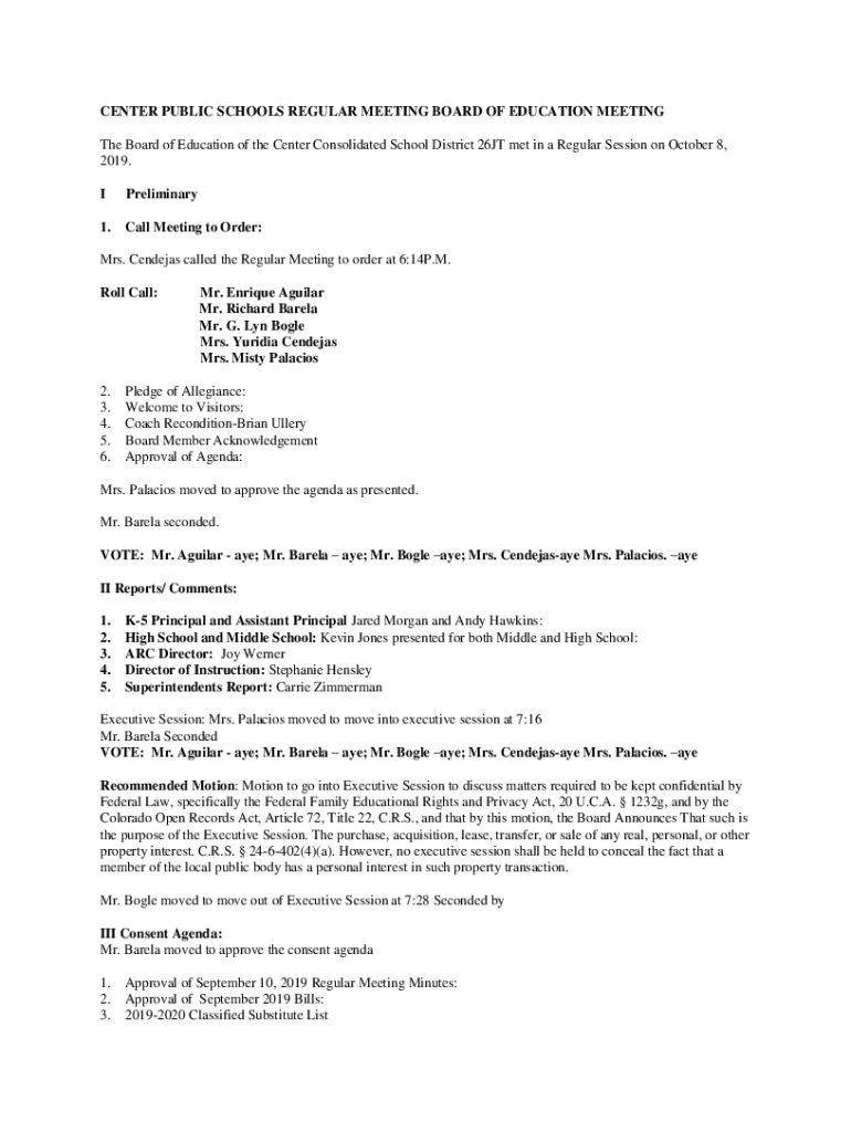 The Board of Education of the Center Consolidated School District 26JT met in a Regular Session on October 8,