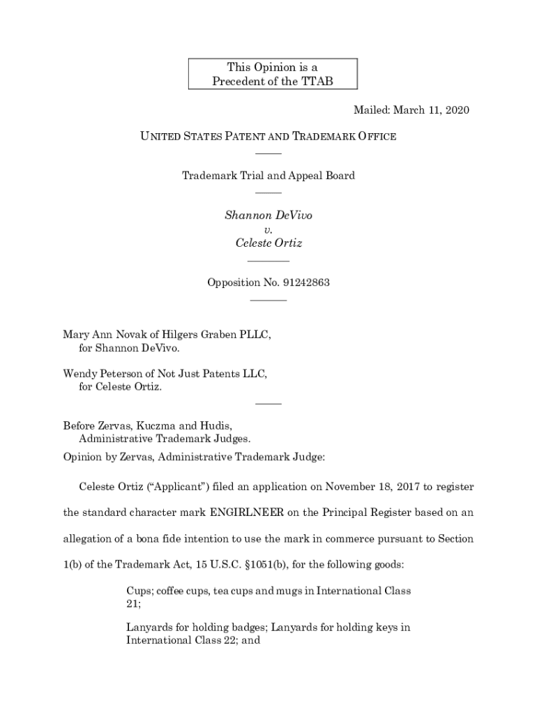 This Opinion is a Precedent of the STAB Mailed: March 11, 2020UNITED STATES PATENT AND TRADEMARK OFFICE ___ Trademark Trial and Appeal Board ___Shannon DeVito v. Celeste Ortiz ___ Opposition No. 91242863