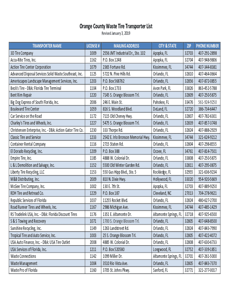 Orange County Waste Tire Transporter List Revised January 3, 2019TRANSPORTER NAME LICENSE # 3D Tire Company 1009 Accurate Tires, Inc. 1162 Action Tire Center Corporation 1079 Advanced Disposal Services