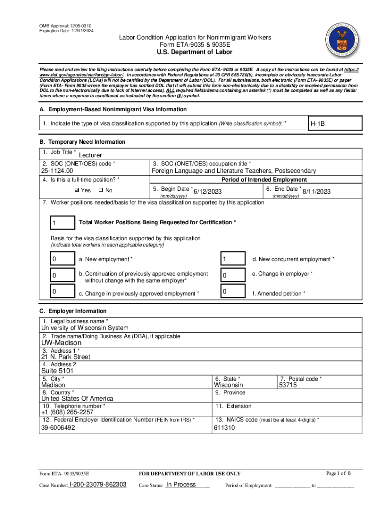 OMB Approval: 12050310 Expiration Date: 12/31/2024Labor Condition Application for Nonimmigrant Workers Form ETA9035 & 9035E U.S. Department of Labor Please read and review the filing instructions