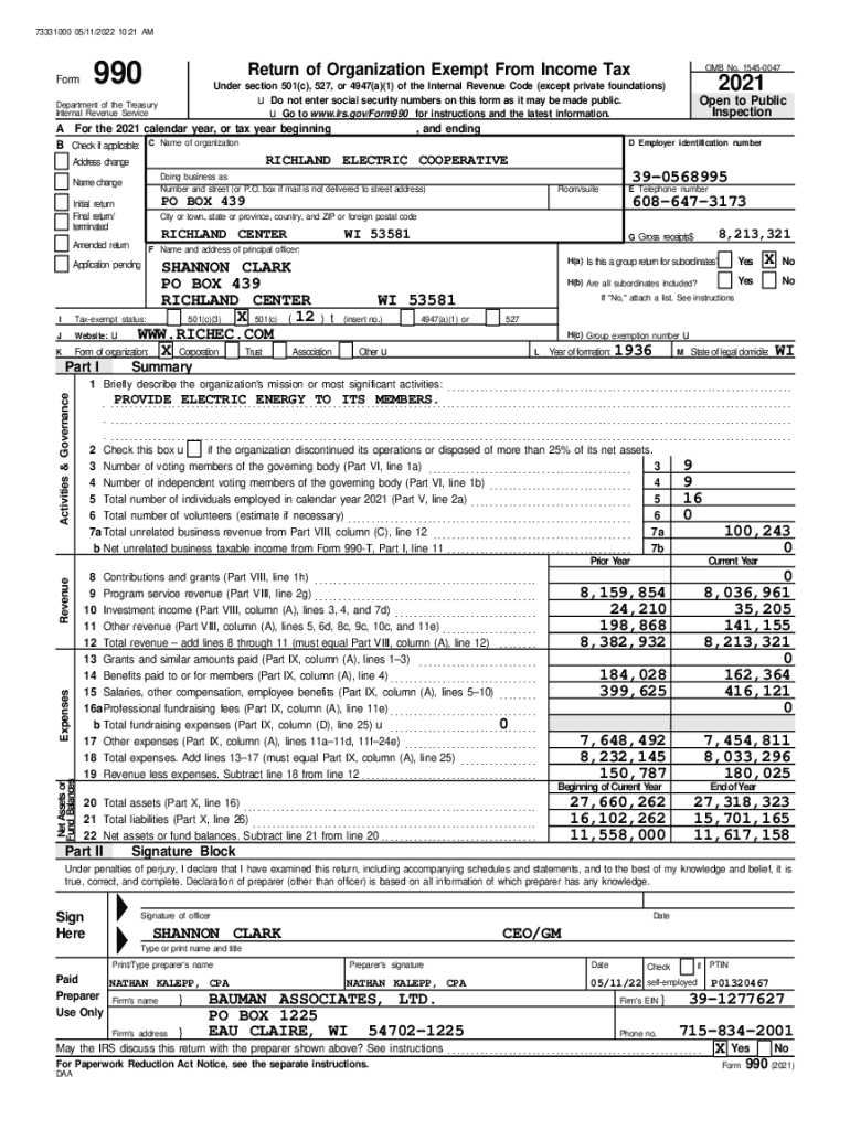 73331000 05/11/2022 10:21 AM990FormReturn of Organization Exempt From Income Taxa For the 2021 calendar year, or tax year beginning B Check if applicable: C Name of organization, and ending D Employer