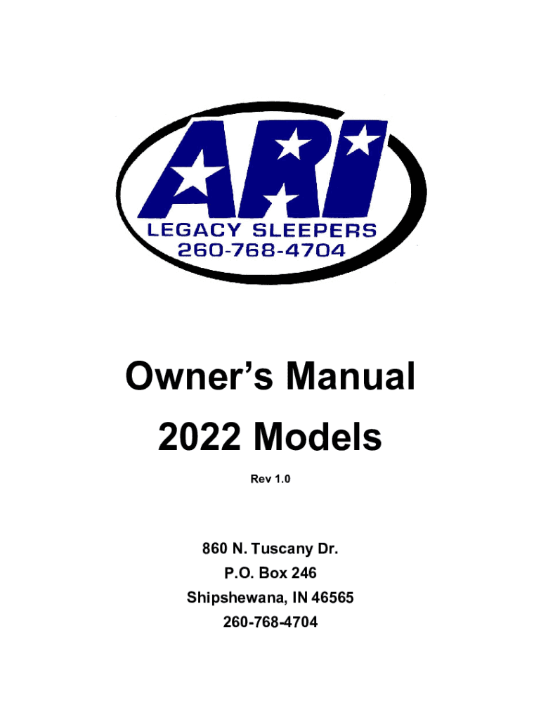 Owners Manual 2022 Models Rev 1.0860 N. Tuscany Dr. P.O. Box 246 Shipshewana, IN 46565 2607684704Table of Contents INTRODUCTION ..........................................................................................................................................................................................................