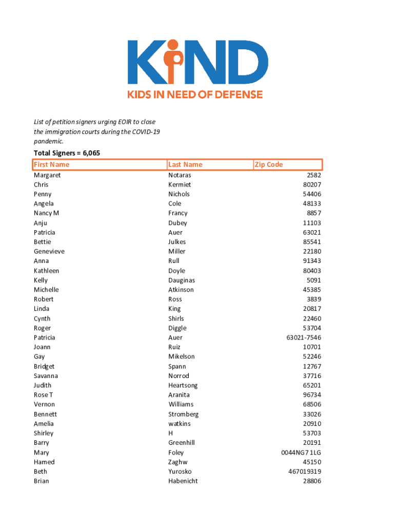 List of petition signers urging EMIR to close the immigration courts during the COVID-19 pandemic. Total Signers 6,065 First Nameless Name Margaret Chris Penny Angela Nancy M AJU Patricia Bettie Genevieve