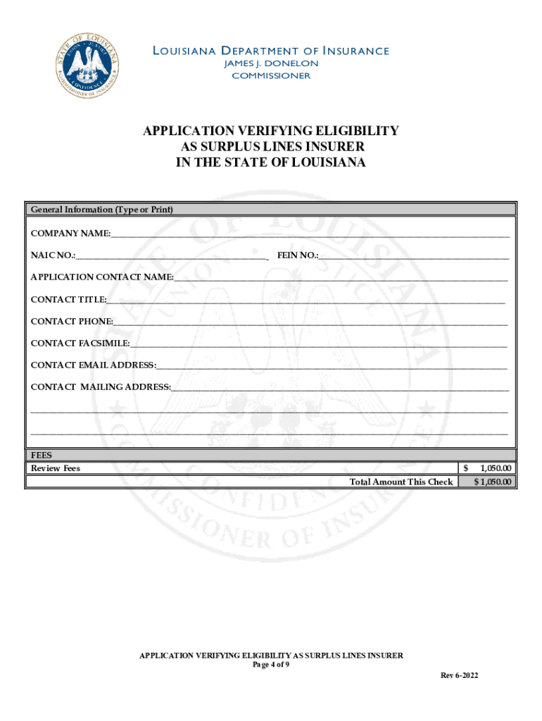 L O UI SIA N A D E P A R T M E TO F I N SUR A N C JAMES J. DONELSON COMMISSIONERINSTRUCTIONS FOR APPLICATION VERIFYING ELIGIBILITY AS SURPLUS LINES INSURER IN THE STATE OF LOUISIANA GENERAL INSTRUCTIONS