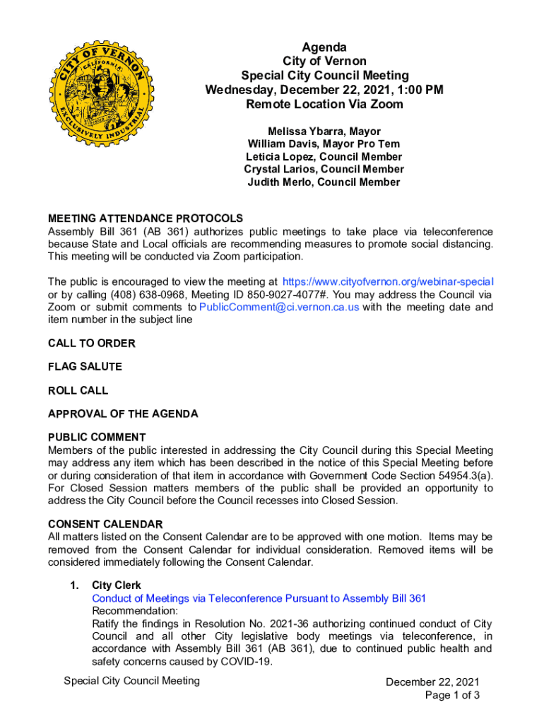 Agenda City of Vernon Special City Council Meeting Wednesday, December 22, 2021, 1:00 PM Remote Location Via Zoom Melissa Ibarra, Mayor William Davis, Mayor Pro Tem Leticia Lopez, Council Member Crystal
