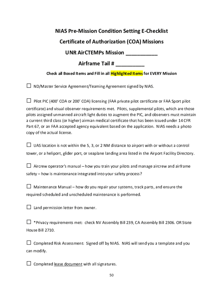 Get the free NIAS Pre-Mission Condition Setting E-Checklist Certificate of ...