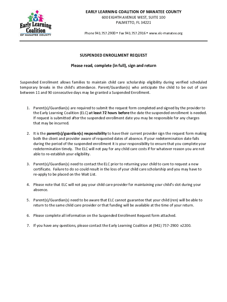 EARLY LEARNING COALITION OF MANATEE COUNTY 600 EIGHTH AVENUE WEST, SUITE 100 PALMETTO, FL 34221 Phone 941.757.2900 Fax 941.757.2916 www.elcmanatee.orgSUSPENDED ENROLLMENT REQUEST Please read, complete
