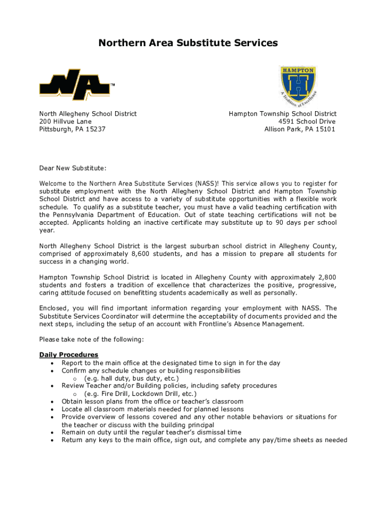 Northern Area Substitute Services North Allegheny School District 200 Hillview Lane Pittsburgh, PA 15237Hampton Township School District 4591 School Drive Allison Park, PA 15101Dear New Substitute:
