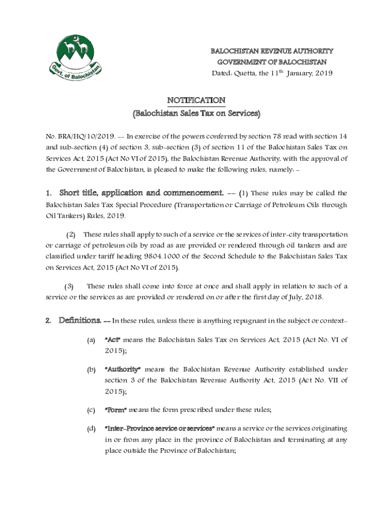 BALOCHISTAN REVENUE AUTHORITY GOVERNMENT OF BALOCHISTANDated: Quetta, the 11th January, 2019NOTIFICATION(Balochistan Sales Tax on Services) No. BRA/HQ/10/2019. In exercise of the powers conferred