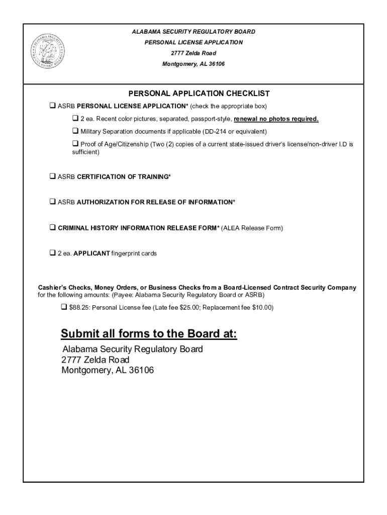 ALABAMA SECURITY REGULATORY BOARD PERSONAL LICENSE APPLICATION 2777 Zelda Road Montgomery, AL 36106PERSONAL APPLICATION CHECKLIST ASB PERSONAL LICENSE APPLICATION* (check the appropriate box) 2 ea.