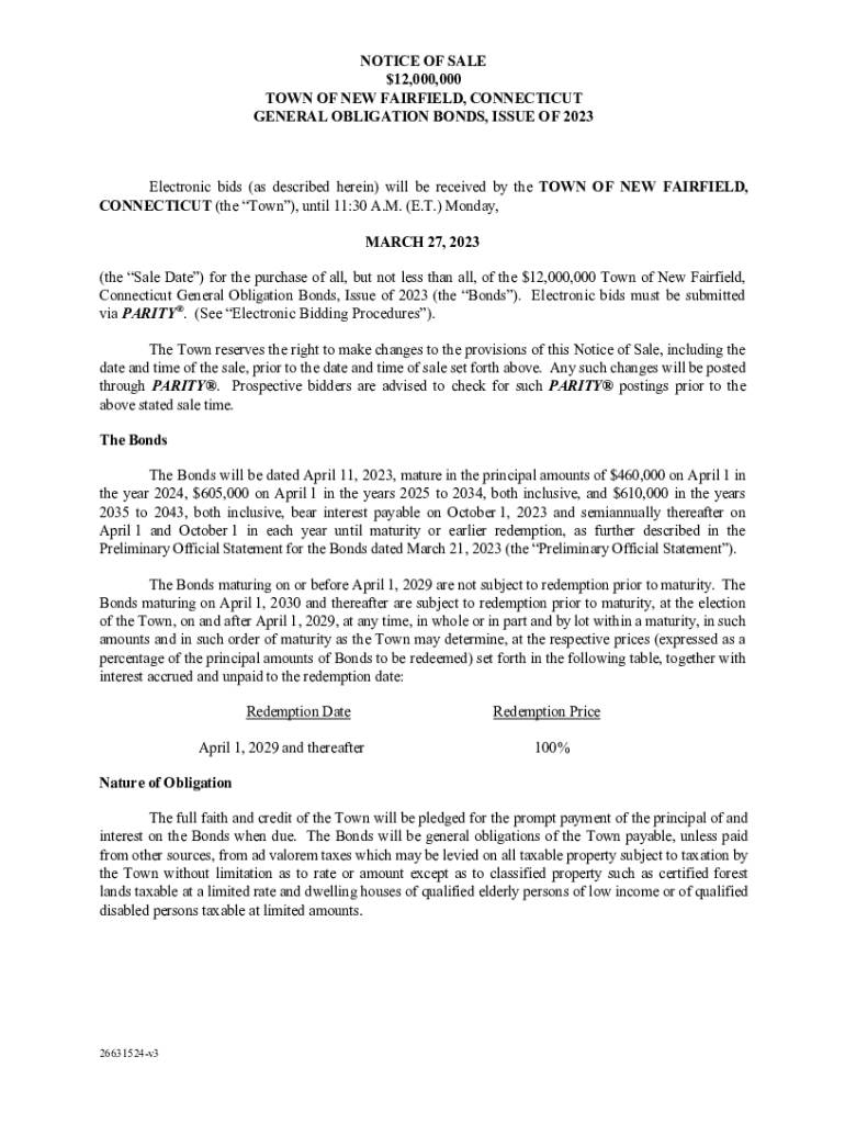 NOTICE OF SALE $12,000,000 TOWN OF NEW FAIRFIELD, CONNECTICUT GENERAL OBLIGATION BONDS, ISSUE OF 2023Electronic bids (as described herein) will be received by the TOWN OF NEW FAIRFIELD, CONNECTICUT