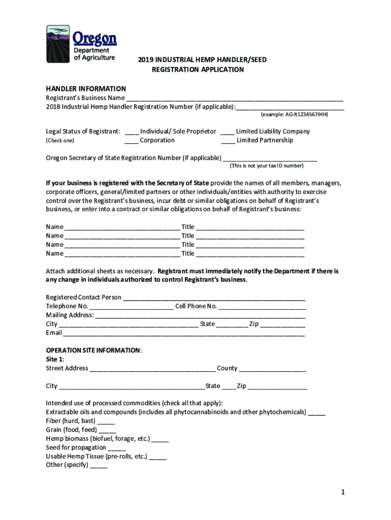 2019 INDUSTRIAL HEMP HANDLER/SEED REGISTRATION APPLICATION HANDLER INFORMATIONRegistrants Business Name ___ 2018 Industrial Hemp Handler Registration Number (if applicable):___ (example: AGR1234567IHH)Legal