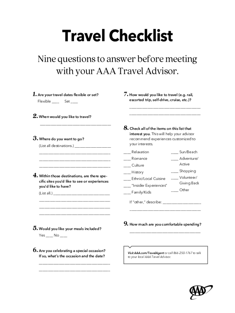 Travel Checklist Nine questions to answer before meeting with your AAA Travel Advisor. 1. Are your travel dates flexible or set? Flexible ___Set ___2. When would you like to travel? ___3. Where do