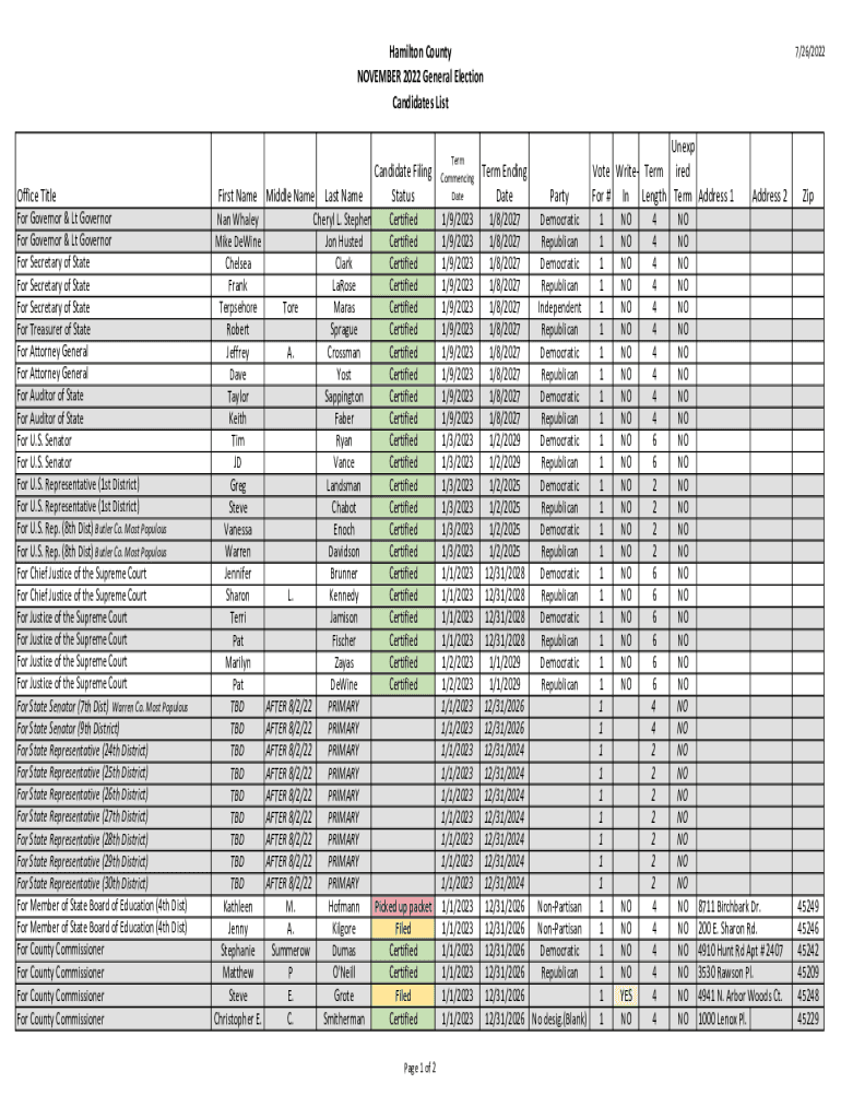 Hamilton County NOVEMBER 2022 General Election Candidates LibreOffice Title For Governor & Lt Governor For Governor & Lt Governor For Secretary of State For Secretary of State For Secretary of State