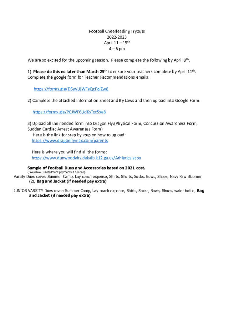 Football Cheerleading Tryouts 20222023 April 11 15th 4 6 pm We are so excited for the upcoming season. Please complete the following by April 8th. 1) Please do this no later than March 25th to ensure