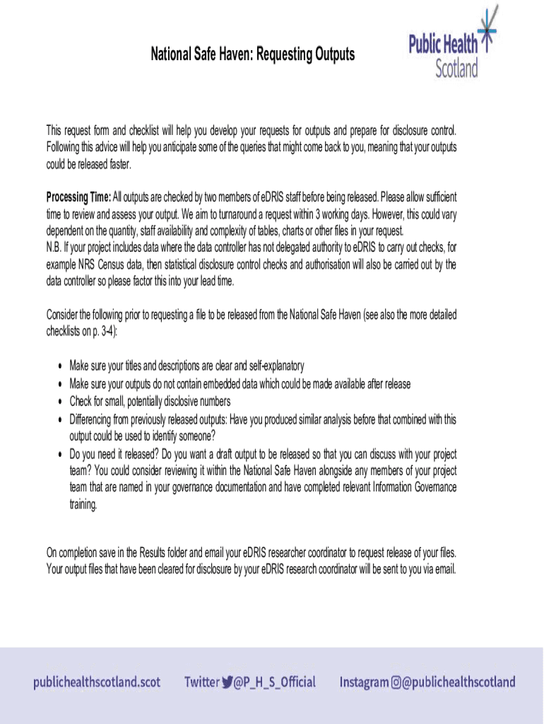 National Safe Haven: Requesting OutputsThis request form and checklist will help you develop your requests for outputs and prepare for disclosure control. Following this advice will help you anticipate